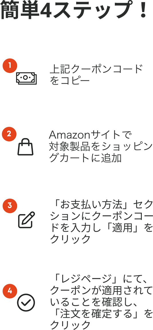 - ・本ページ上のクーポンコードをコピー下さい。Amazonサイト上にて、対象製品をカートへ追加、レジへお進みください。